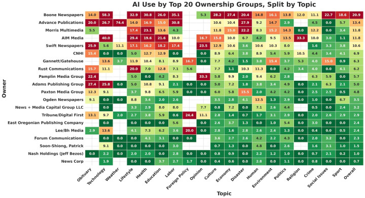 报纸的所有权影响AI使用率。BooneNewspapers的AI文章占比超过20%,AdvancePublications为13.4%,而NashHoldings、LeeEnterprises与DigitalFirst等大型连锁将AI使用限制在2%以下。